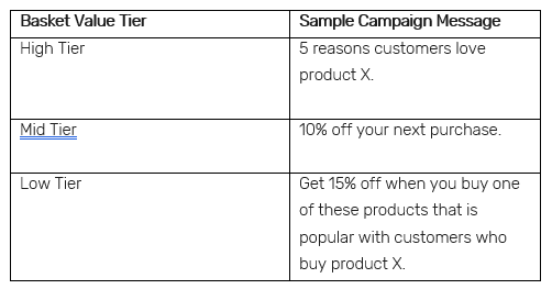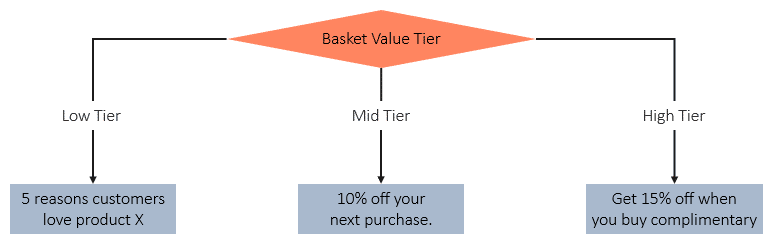 You can ensure triggered campaigns differentiate between customers by leveraging a basket value model in conjunction with the trigger. By combining these two data points, the historical basket value with the real-time trigger can easily segment customers into multiple tiers or group different clusters together into tiers—for example, low, medium, and high.