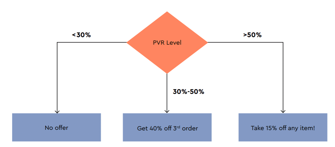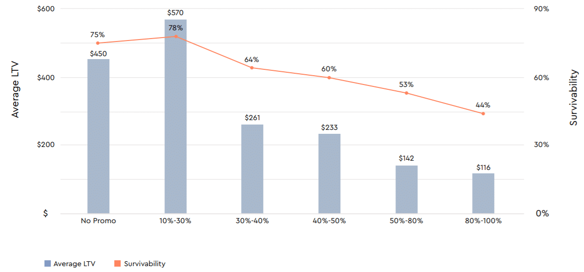 As seen in the chart below, customers who either did not use a promotion or had a PVR of less than 30% showed significantly higher lifetime value. Furthermore, they discovered that the lower the PVR, the higher the customer survivability rate.