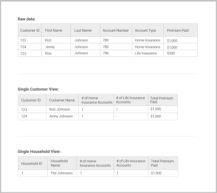 From these illustrations here, you can understand the issue of solely maintaining a single customer view while not referencing a household view (and vice versa in some cases):