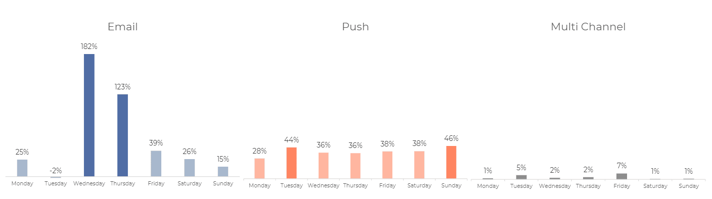 To find the best time of the week to send an Email or Push Campaign, Optimove marketing data analysts looked at three types of metrics: