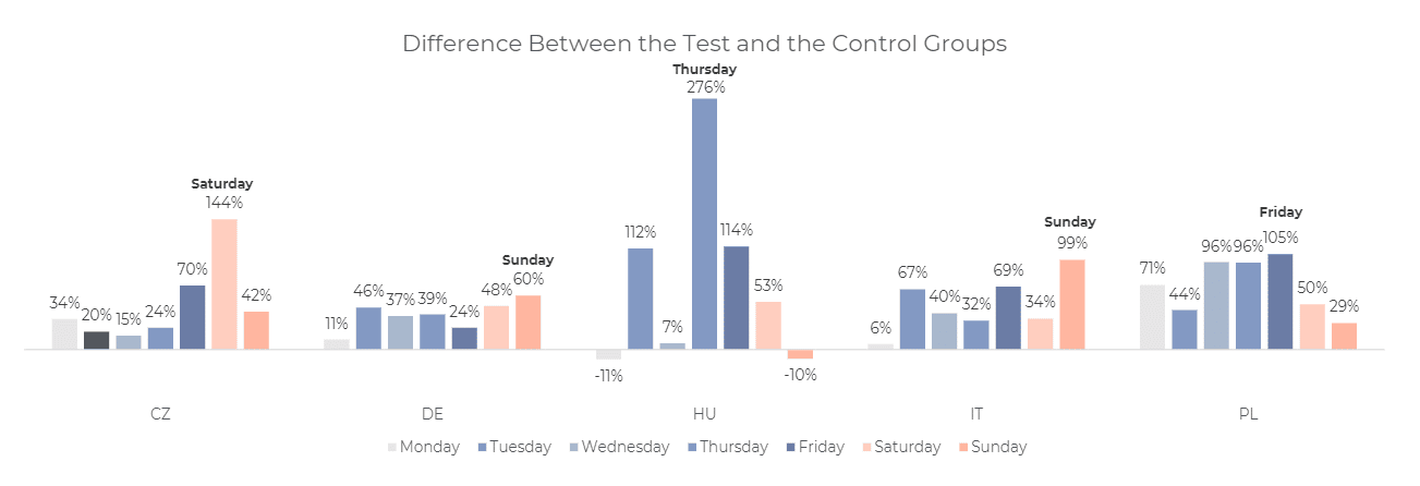 Optimove data shows that the test group's open and response rate was 276% higher for Hungarian customers who received a push notification on a Thursday than the control group.