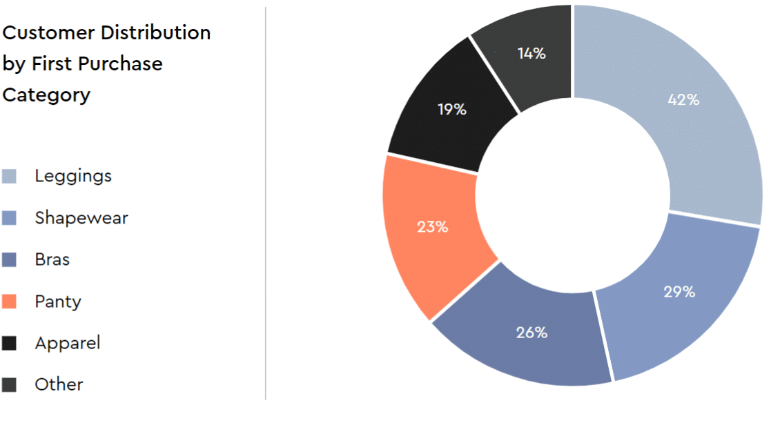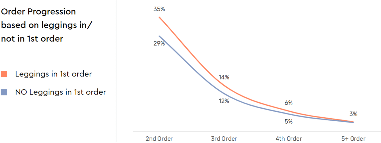 In this specific case, the most pronounced correlation was among customers who bought leggings in their first purchase. Research shows that these customers were 20.7% more likely to make a second purchase (35% vs. 29%), 16.7% more likely to make a third purchase (14% vs. 12%), and 20% more likely to make a fourth purchase (6% vs. 5%).