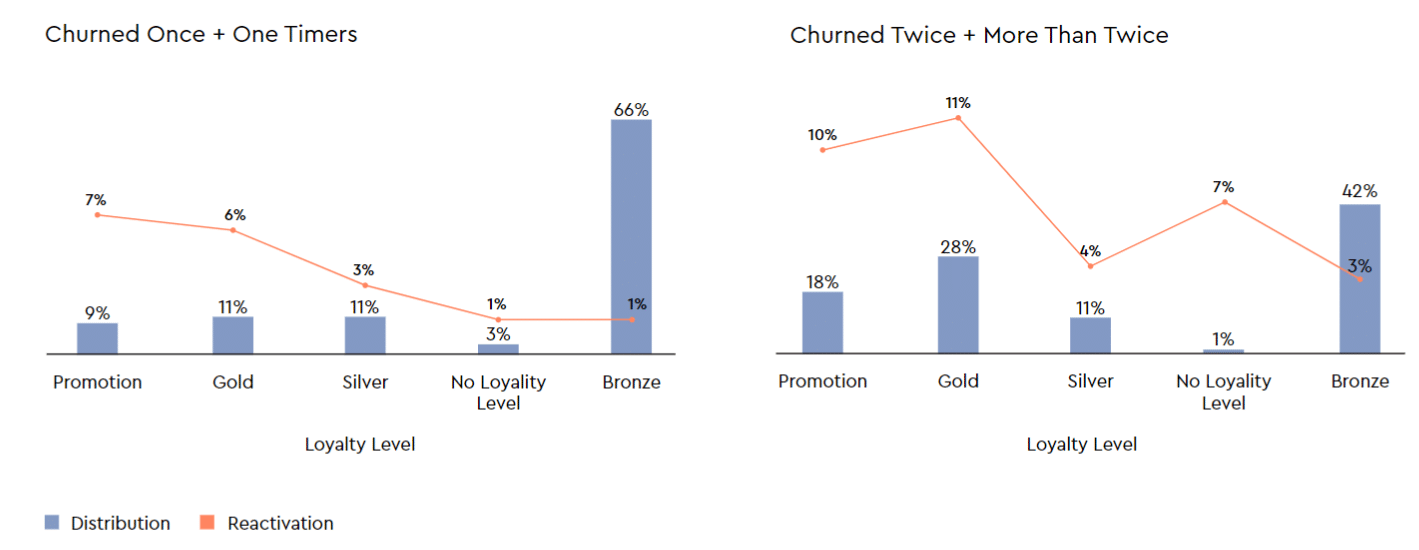 Using these customer loyalty insights, these marketers decided to provide the “No Loyalty Level” group with incentives similar to those given to their Promotion and Gold groups, to incentivize reactivation and retention. The marketers also set up monthly recurring campaigns with varying levels of incentives, based on how long each customer was inactive.