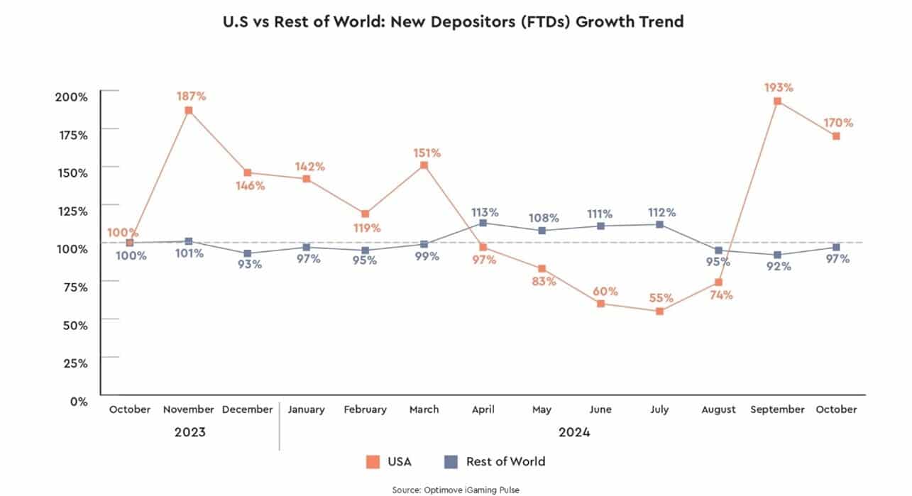 After a sharp decline in First-Time Depositors (FTDs) beginning in April, the U.S. typically sees peaks in September with the start of the NFL season and November as playoff excitement builds. This year, however, the growth momentum extended into October, marking a notable shift in player behavior.