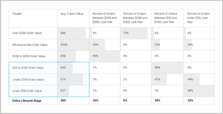 Let’s look at this example from a large online retailer: Customers who make purchases of less than $100 per order have double the future value of customers who make purchases of only under $50 or only $50-$100 (specifically, $79 average net revenue per customer over the next year, compared to $37 and $48, respectively).