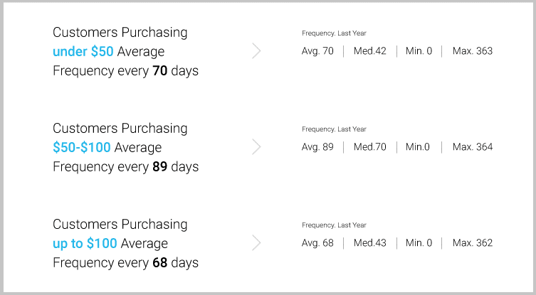 According to this data, it’s clear that those customers who only make purchases of less than $50 should be incentivized to increase their purchase amount. Those customers with purchases of only $50-$100 should actually – and counter-intuitively – be encouraged to make purchases of $50 or less, thus encouraging them to follow the purchasing behavior of customers with similar behavioral patterns. The expected result will be an increase in purchasing frequency, and thus an increase in future value.