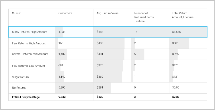 The data, however, reveals a completely different story. Below are two examples from two different retailers of customer segments with the highest rate of returns/cancellations – and they actually have the highest future value! Counter to common assumptions, the data here shows that these customers are not unsatisfied with the brand, but rather are deeply involved with it and have had enough satisfying experiences of returns or cancellations to trust the brand with their business.