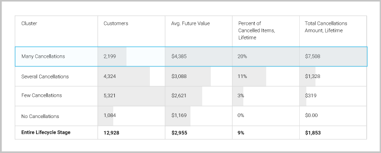 Another enlightening data revelation comes from the area of item returns and order cancellations. We intuitively assume that customers who make a lot of returns and/or cancellations are unsatisfied with the brand and therefore have a low lifetime value.