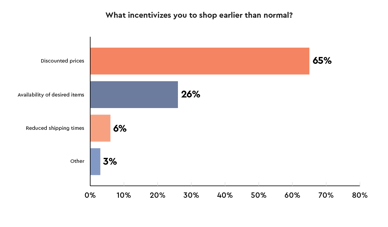 To meet customer expectations this year, marketers should not wait before they begin their marketing efforts. Fifty percent (50%) of consumers plan to start holiday shopping by the end of October, however, forty-six percent (46%) will not wait for Black Friday or Cyber Monday deals to start shopping, and 65% can be incentivized to start shopping earlier by discounted prices.