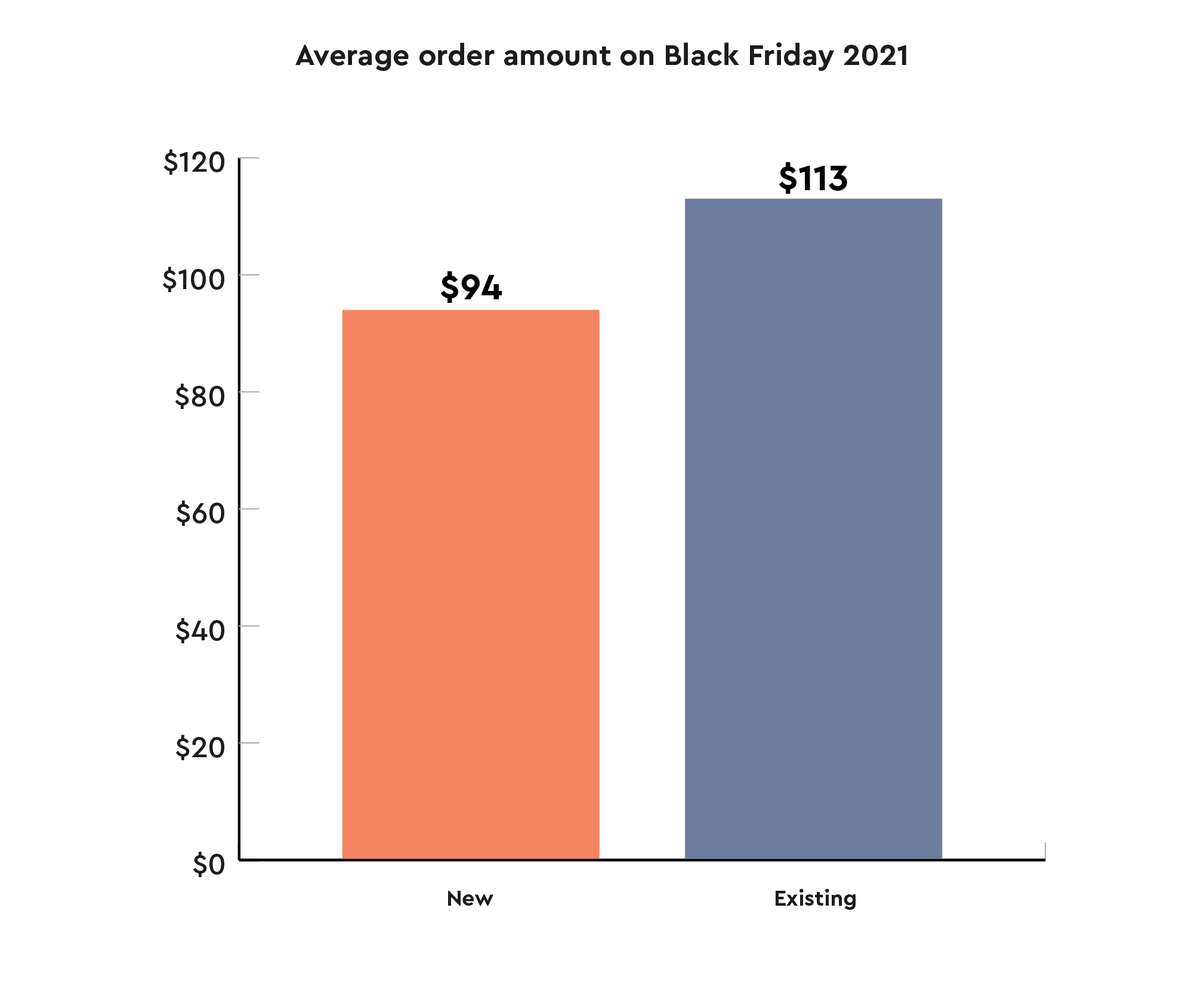 On Black Friday 2021, the average spend of existing customers was higher than newly acquired customers. New customers spent $94 on average while existing customers spent $113 that day.