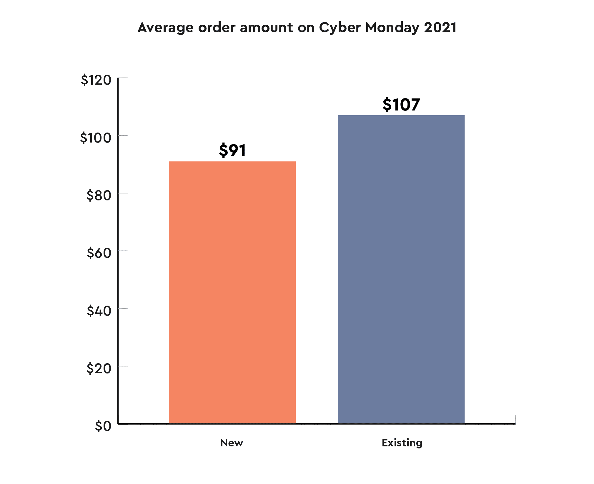 On Cyber Monday, new customers spent $91 on average, while existing customers spent $107 that day.