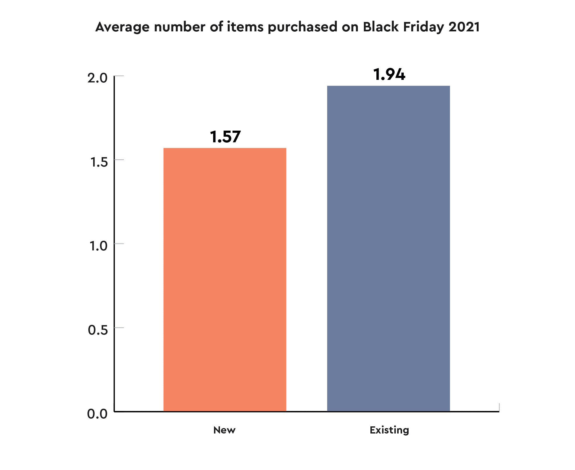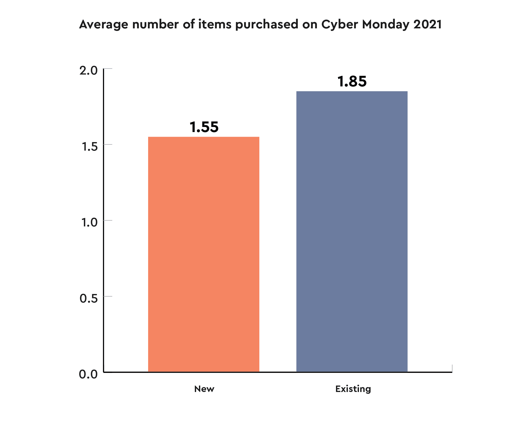 The average number of items customers purchased during peak season last year was lower for new customers versus existing ones, 1.57 versus 1.94 items on Black Friday and 1.55 versus 1.85 items on Cyber Monday, respectively.