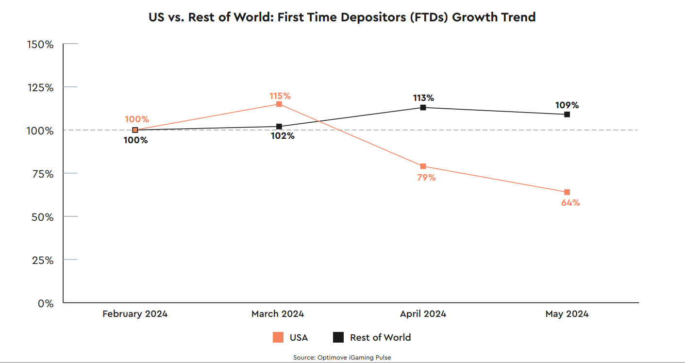 In May, the trend of a decreasing number of First Time Depositors (FTDs) in the US continued, showing a significant 36% drop compared to the February baseline. The chart below illustrates this trend.
