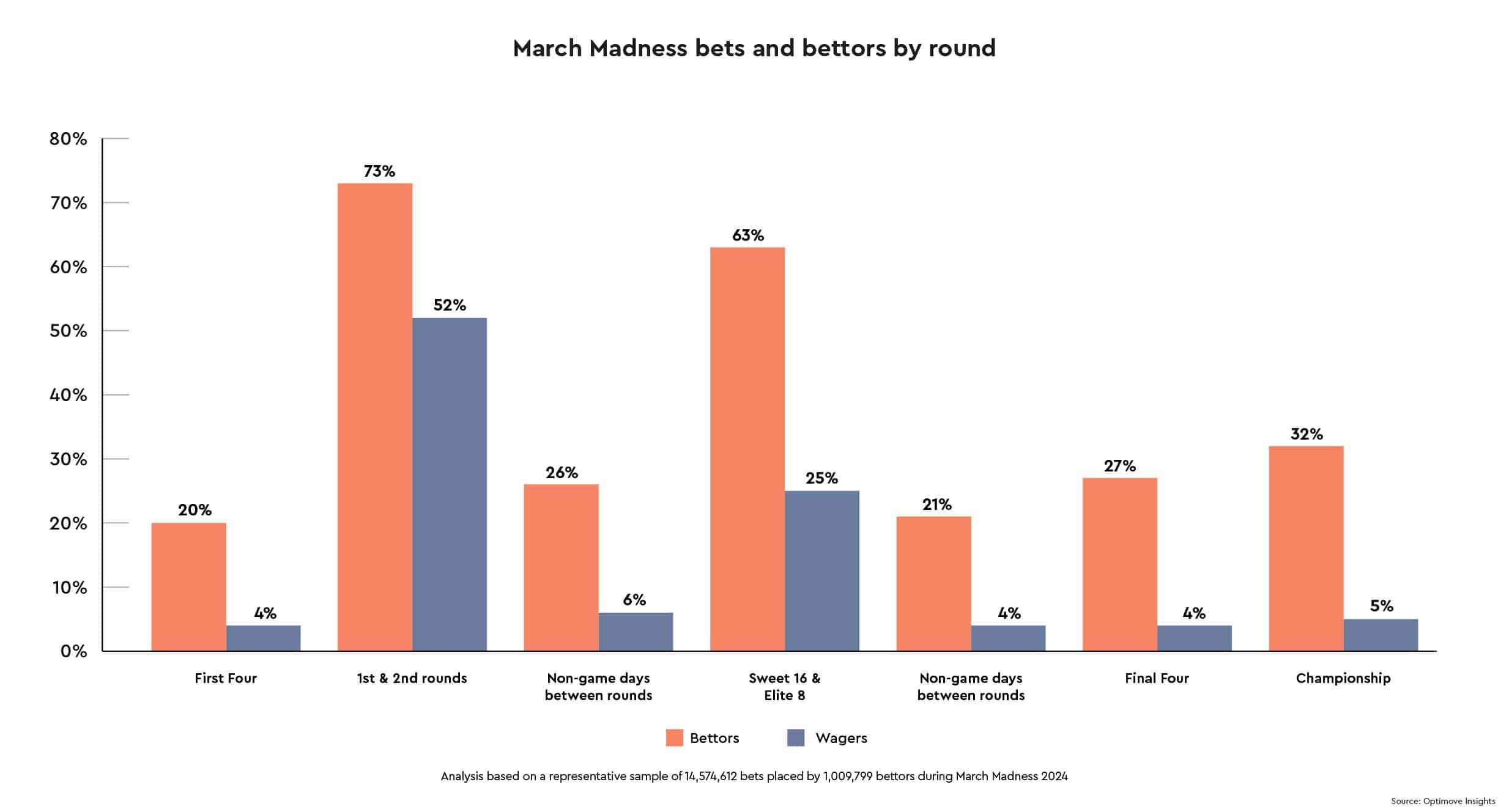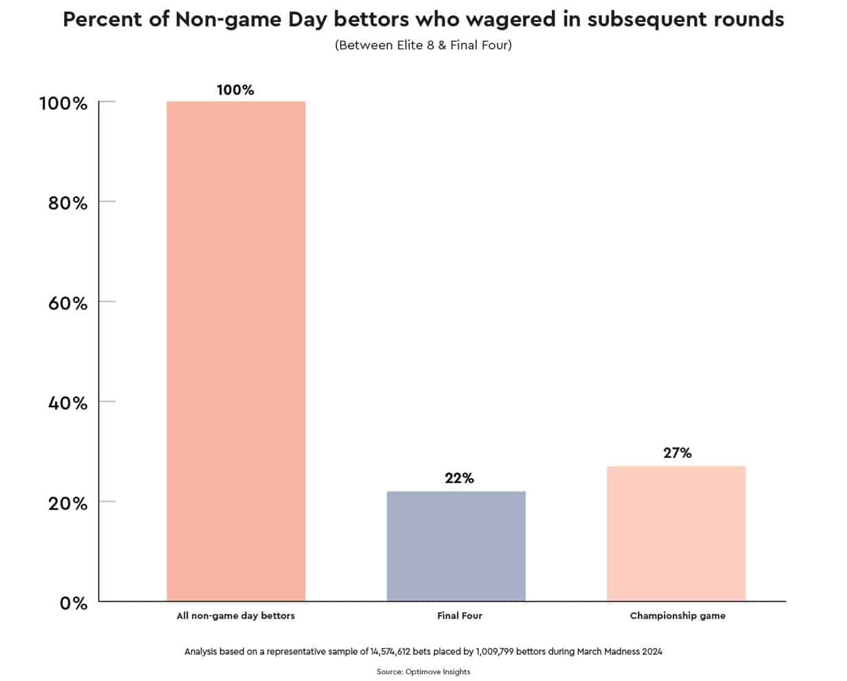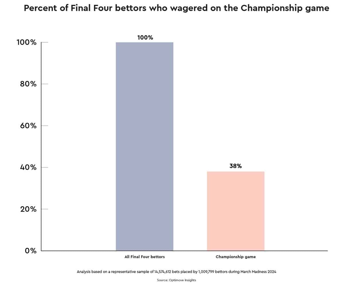 The number of bettors in the Championship Game (32%) was higher than in the Final Four (27%), but the bet volume remained low (5%), suggesting casual or smaller-value bets.