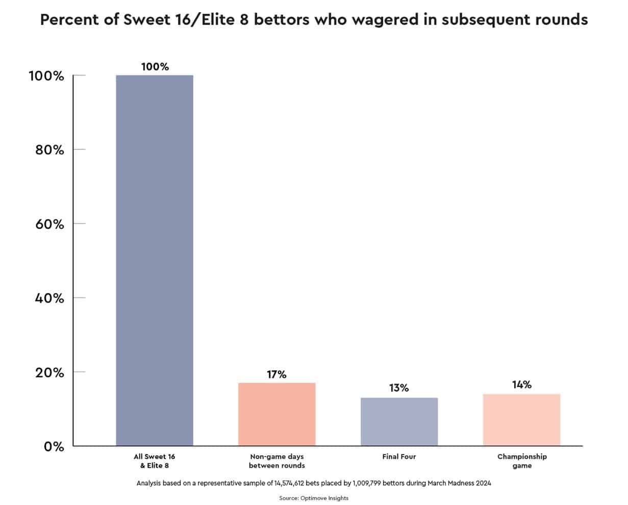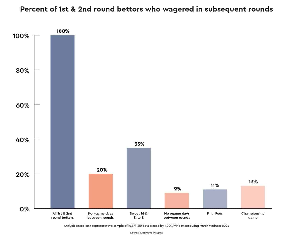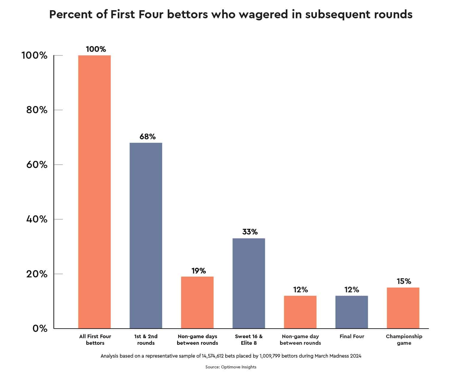 Implication: These bettors show slightly stronger continuation than First Four bettors but still show diminishing engagement as the tournament progresses.
