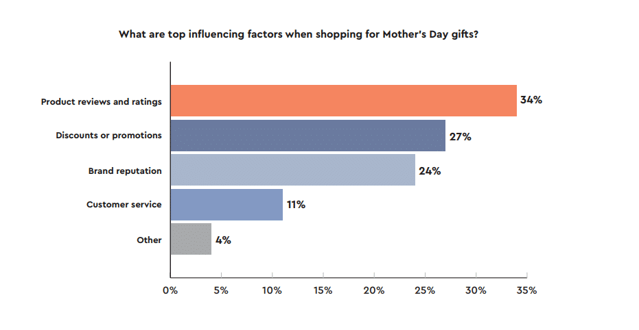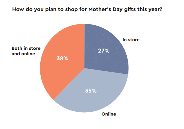 According to our Mother’s Day survey, 38% of the respondents intend to shop using both in-store and online channels, 27% plan to shop solely in-store, and 35% prefer exclusively online shopping.