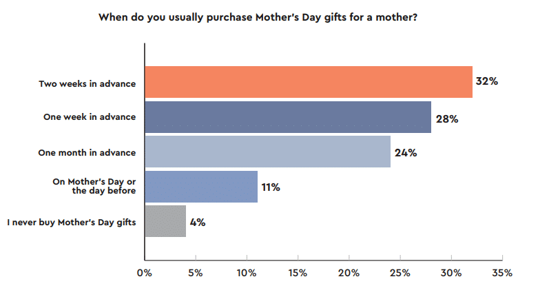 56% of shoppers plan on buying Mother's Day gifts at least two weeks in advance. And another 28% will be ready with a gift at least one week ahead. Just one in ten, understandably, will push their luck with a last-minute buy.