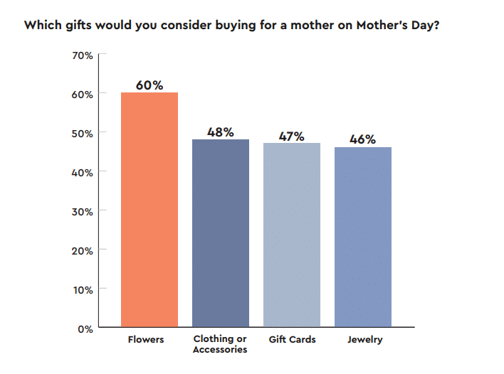 60% of respondents plan on buying their mama’s flowers, while about 45% said they’d buy clothing, gift cards, or jewelry. 75% will buy a greeting card (mental note!), with 45% choosing a physical card, 19% an online card, and 11% both.