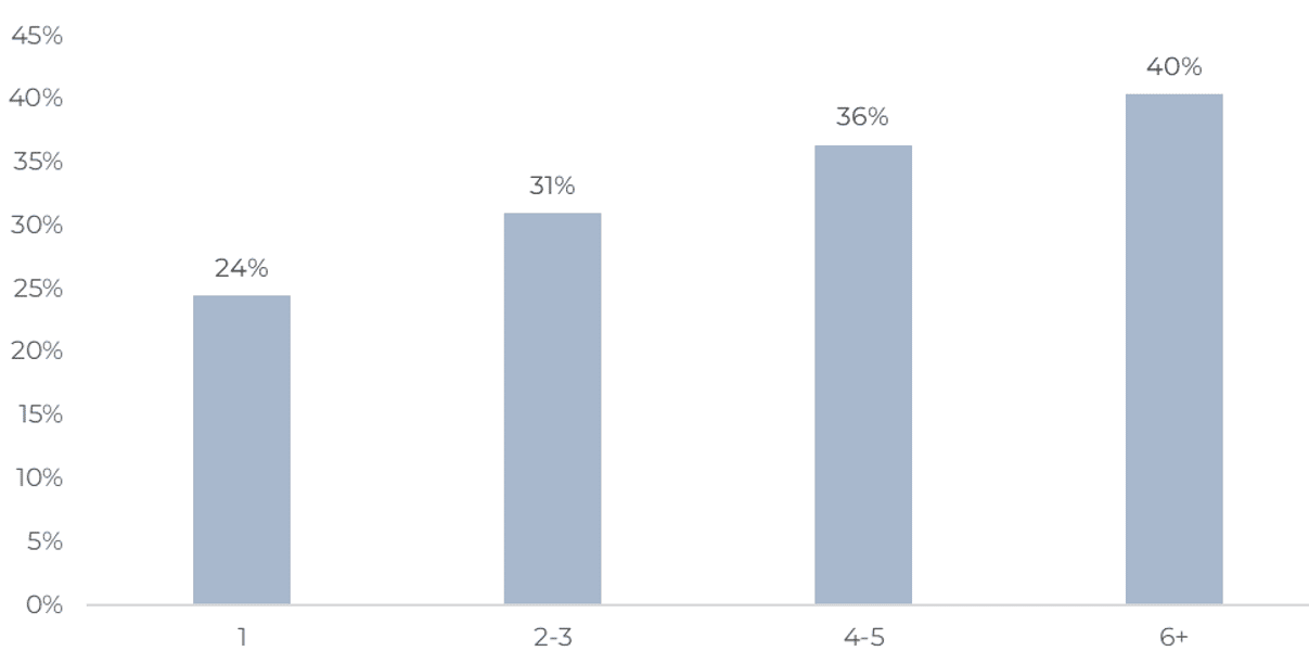 Out of all shoppers who purchased between four and five items, 36% went on to make an additional purchase, making them 49% more likely to place a second order compared to those who bought one item in their first order.