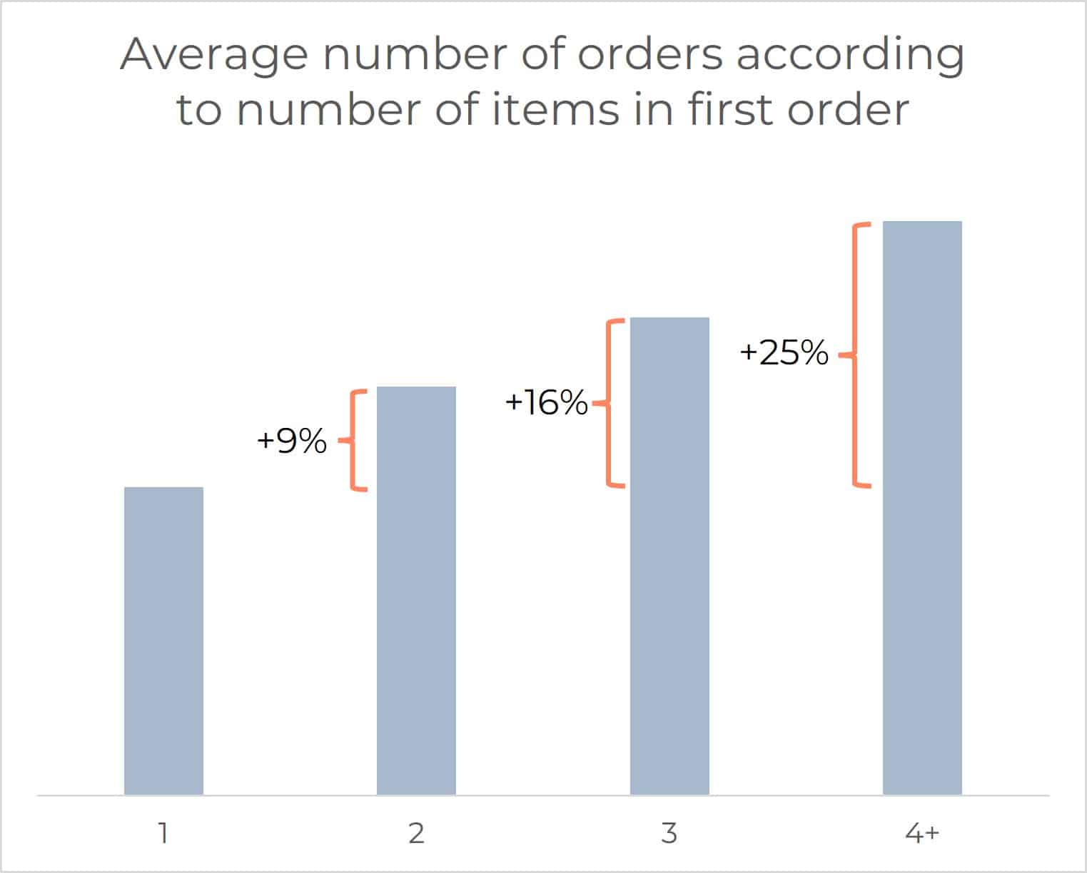 Finally, those who purchase four or more items in their first order placed an average of 25% more orders in the future.
