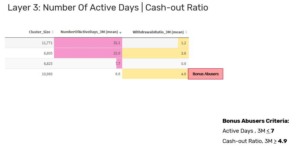 In this KPI, players who have a low number of active days and high cash out ratio are the bonus abusers as they rarely log in and withdraw in high amounts.