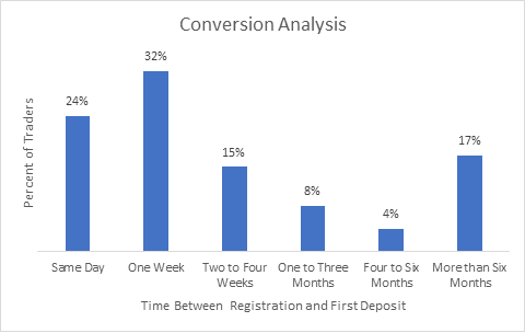 Another Optimove trading client discovered that 56% of registered traders make their first deposit within a week of registering, and 42% of these registered traders convert on the same day.