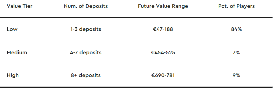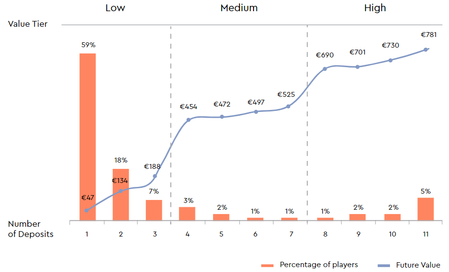 As you can see in the chart below, for the fantasy sports betting website represented by the following player data, three clear value tiers are corresponding to the number of deposits made: