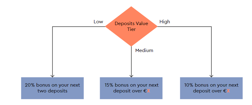 The medium and high tiers each received deposit matching bonuses of 15% and 10%, respectively, for deposits higher than the average of their individual deposits to date. For example, if the average of a player's first five deposits was €115, the minimum deposit amount to receive the bonus would be set at €120.