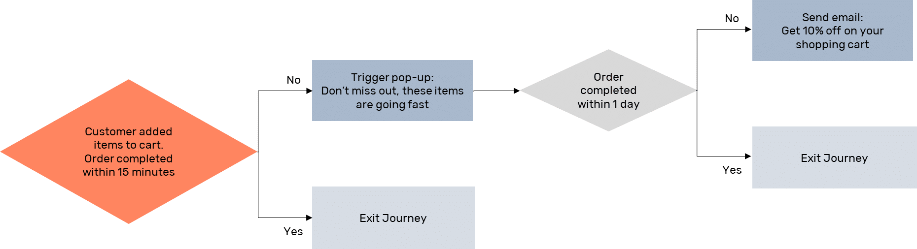 See the example below of an abandoned cart customer journey that marketers can create to encourage clients to complete their order: