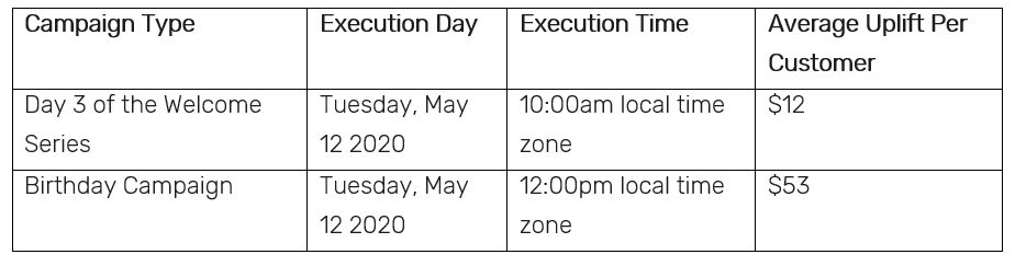 Alternatively, you can choose to send the ‘Day 3 of the Welcome Series’ and the ‘Birthday Campaign’ by including customers who received other communications that day.Knowing that the average uplift from a ‘Birthday Campaign’ is $41 higher than the ‘Welcome Series’ campaign highlights the significance of sending their customers the former. Marketers, who use prioritization and exclusion orchestration practices, can choose to prioritize the ‘Birthday Campaign’ despite it being a communication scheduled for later.