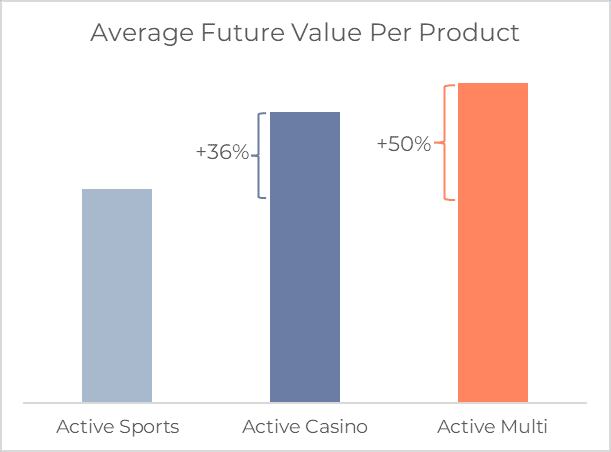 We found that casino players’ future value is 36% higher than sports players. But it is the multi-players who have the highest average future value**. 50% higher** than sports players on average!