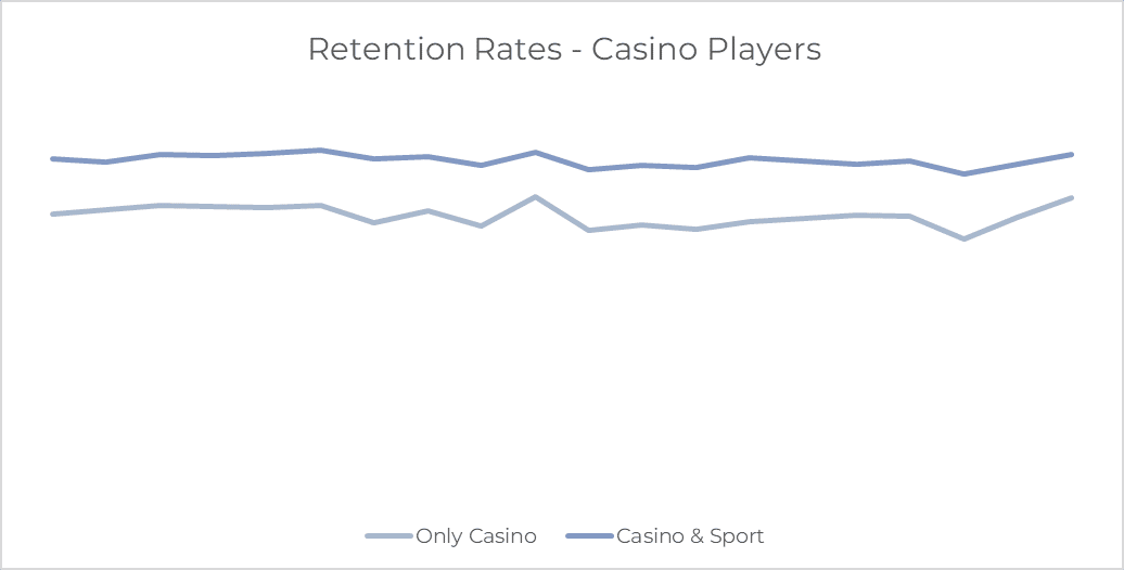 We checked the retention rates of sports and casino players and found that casino players who played at least one sports game have higher retention rates than casino players who never played sports games. The trend looks similar in sports players who played at least one casino game, as data shows they also have higher retention rates.
