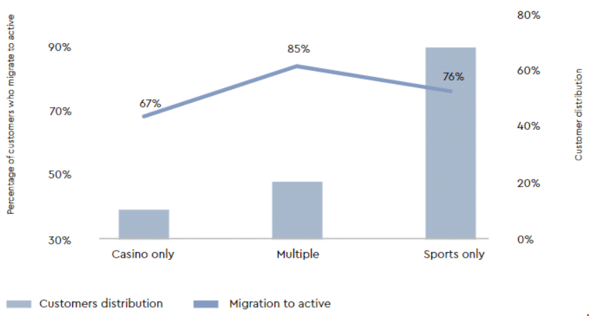 Optimove research shows that by the 8th day following a player's initial deposit, the majority of these players display a level of loyalty to the products they prefer. Players who've had activity in more than one product have higher rates of migration to the active stage, as seen below: