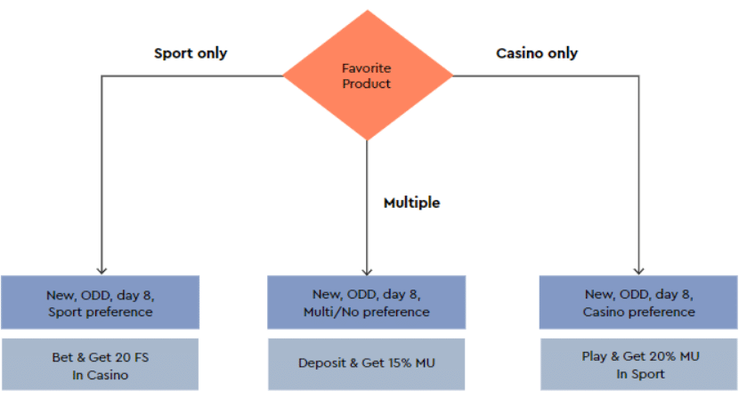 You can send cross-selling offers to players with single product preferences to increase the likelihood of a player becoming and remaining active. Using unique player segment capabilities within Optimove, you can create three separate campaigns based on the player's product affinity: