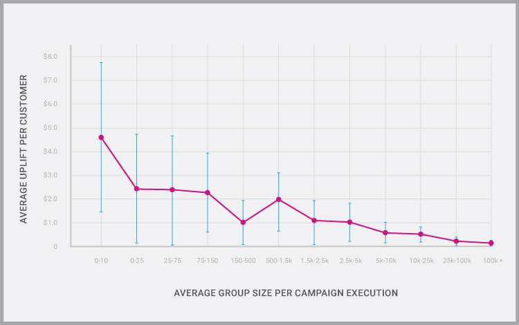 Our data set consisted of over 30 million customers and 2,000 campaigns, delivered to target groups ranging in size from one customer per group to groups of over 100,000 customers. For each target group size, we measured the average campaign uplift. We plotted the results – average uplift per customer and the extent of each group's results volatility – on a graph:
