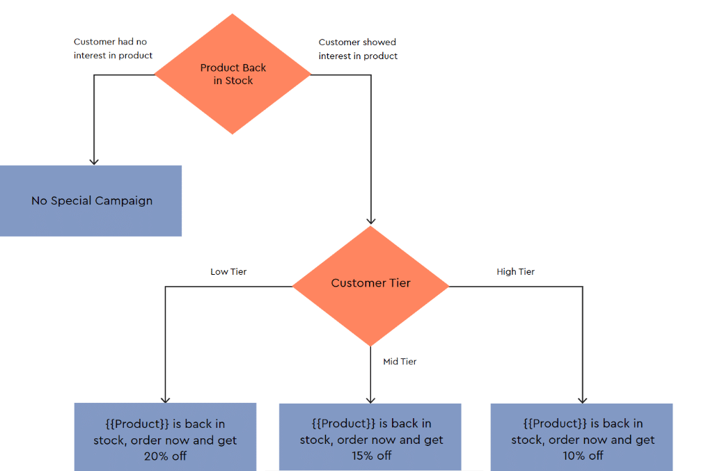 The flowchart below demonstrates how you can personalize your message, by segmenting your customers into three tiers based on their average order amount: low, medium, and high. This will allow you to offer different discounts to each customer based on their tier to increase your campaign's monetary value.