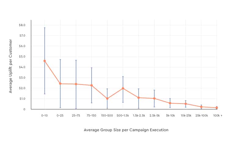 Our data set consisted of over 30 million customers and 2,000 campaigns, delivered to target groups ranging in size from one customer per group to groups of over 100,000 customers. For each target group size, we measured the average campaign uplift. We plotted the results – average uplift per customer and the extent of each group's results volatility – on a graph: